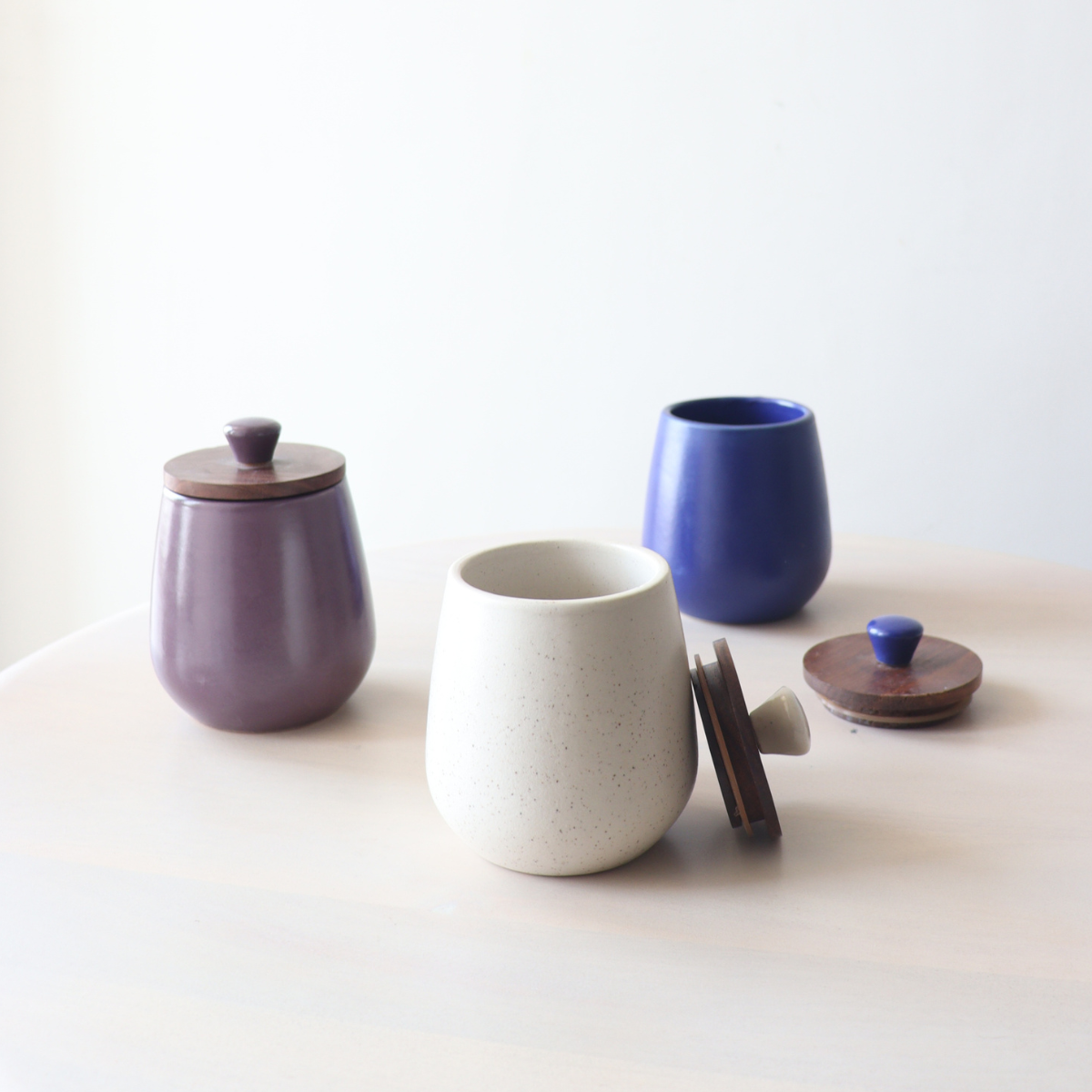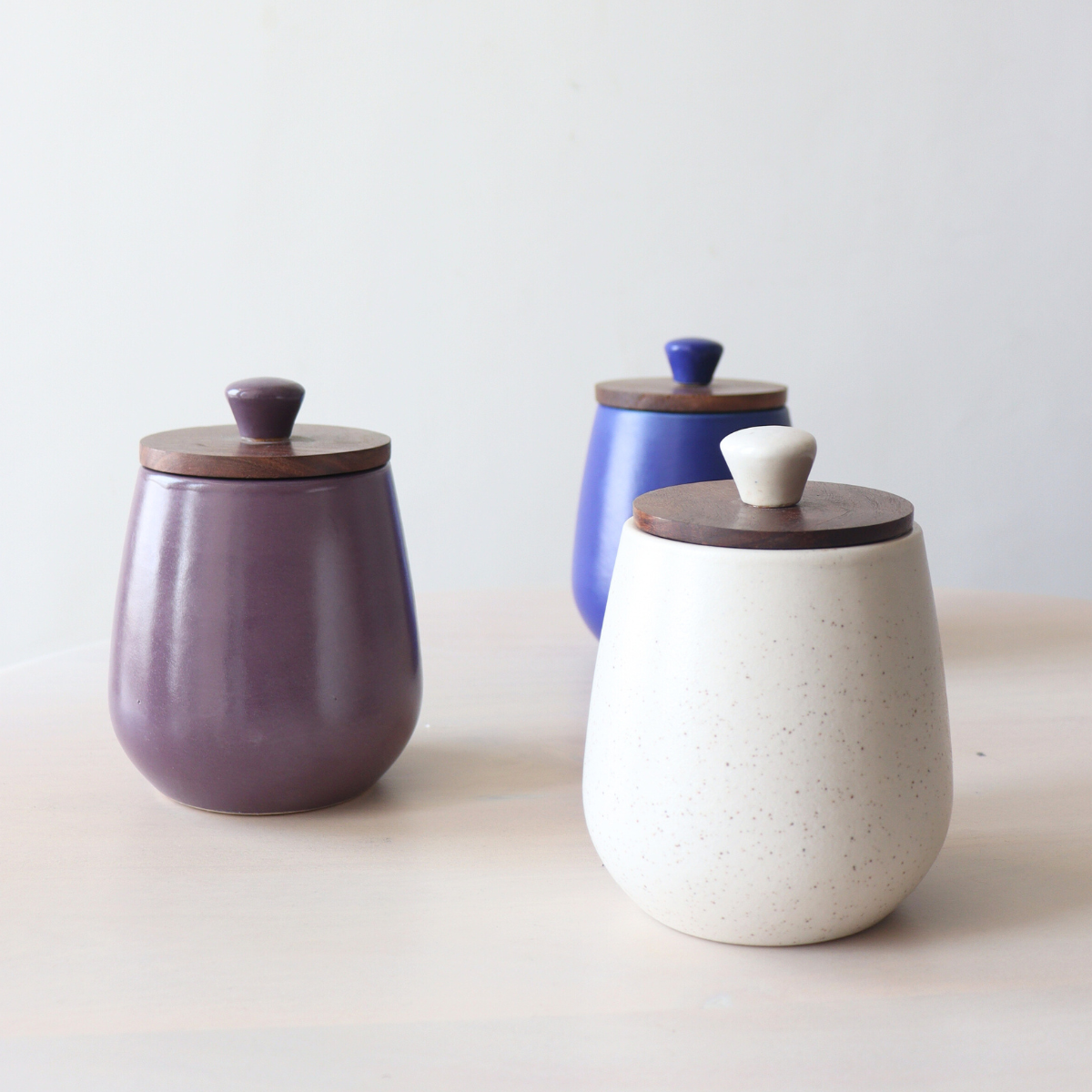 Handcrafted in Stoneware, Ceramics. Labour of love straight from Khurja. The lid is made with Mango wood with a silicone ring around it to make the jar airtight.